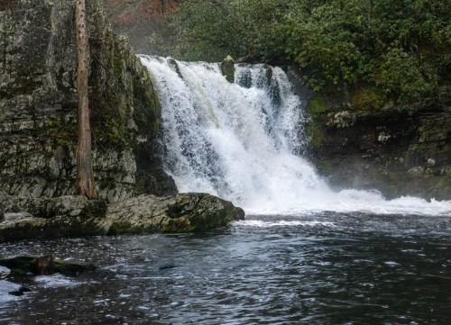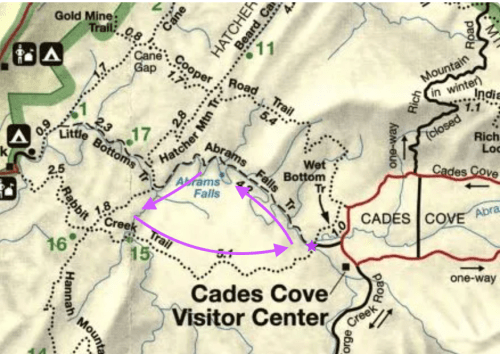 We started our trail at the purple star on the map. Our friends graciously pulled our four red bulls, and we got our wings and flew onto the trail. The Abrams Falls trail was much less strenuous than the Alum cave route, but beautiful in its own way. It was interesting because you start at a location much higher than the falls, and make your way by mostly descending until you get to the waterfall. What makes the trail so lovely is the winding creek you following throughout the entire route. The trail follows the creek with opportunites to walk out onto rocks in the stream if you wanted. At the end of roughly 3 mile walk, you get the opportunity to absorb this absolutely stunning waterfall.