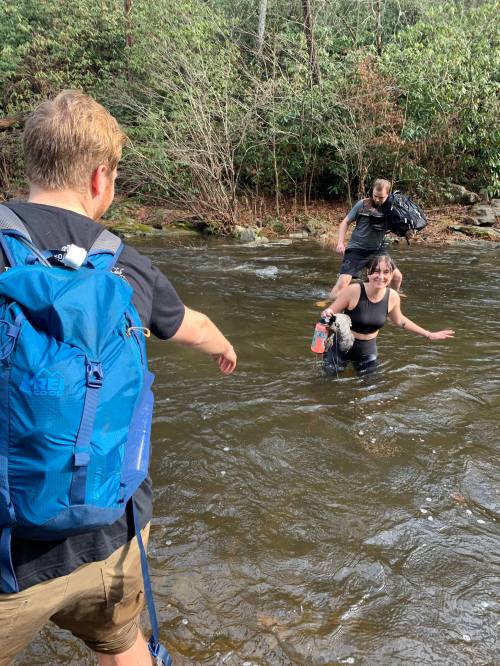 About a half mile into the Hannah Montana trail, will be probably the moment I remember forever when I look back on this trip. As we were walking and looking around, we came back to our lovely creek friend except this time, he blocked our trail. We didn’t realize it, but the route we were following involved crossing rivers without bridges, and like I mentioned before, we had a storm the night before. There would be no way to cross this without being very wet. We all looked at each other, pondering whether or not to take the plunge across the river. I looked upon the group, feeling my wanderlust mantra and said outloud, “Why Not?” Everyone looked up, smiled, and decided fuck yeah, let’s do this. We took off our shoes and socks, and got ready to get soaked in the river. I brought a pole, so I lead the pack. The rocks in the river were SLICK. We needed to really keep balance or we would have fallen completely in. I found a route and we went through in a line. Now I’m a rather tall guy, roughly 6’3″, and I got nearly waist deep here. As soon as I made it across I was able to help the others by passing the pole and helping people out of the water. From this point forward, the resulting train and our bond with Ashlyn and Amy was changed. We were now friends, not acquaintences with our fellow campers. From then on out the dynamic was more goofy, silly, and in my opinion, just more fun! We all kept repeating, “Why Not?” to anything we could think of. I started asking my goofy questions like, “What three objects would you want to be summoned by?” and we continued forward enjoying the time.