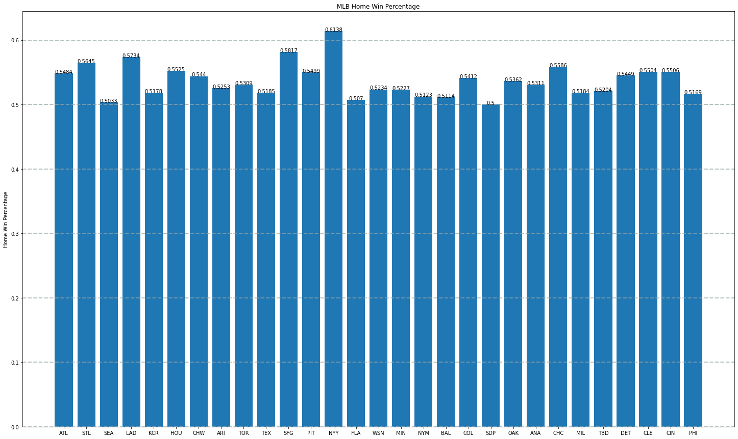 As someone who has been a sports fan their entire life, the question, “Does it really matter if a team is at home?” has always fascinated me. Do players crack under pressure more? Do the fans sway the referree? What does the data show? Due to the wide variety and popularity of different sports out there, I’m going to break this down into a three part series where I’ll analyze my favorite three to watch: Baseball, Basketball, and American Football. If there’s enough desire, I can expand these studies to other sports as well!