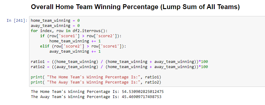 We accomplished this by creating a dataframe of all the team names (df3), and searched our games database for every instance that a team was at home. If they won at home, that was counted in one variable, and if they lost at home, that was tallied in another. Create a ratio between the two, and bam, you know how a team performs at home.