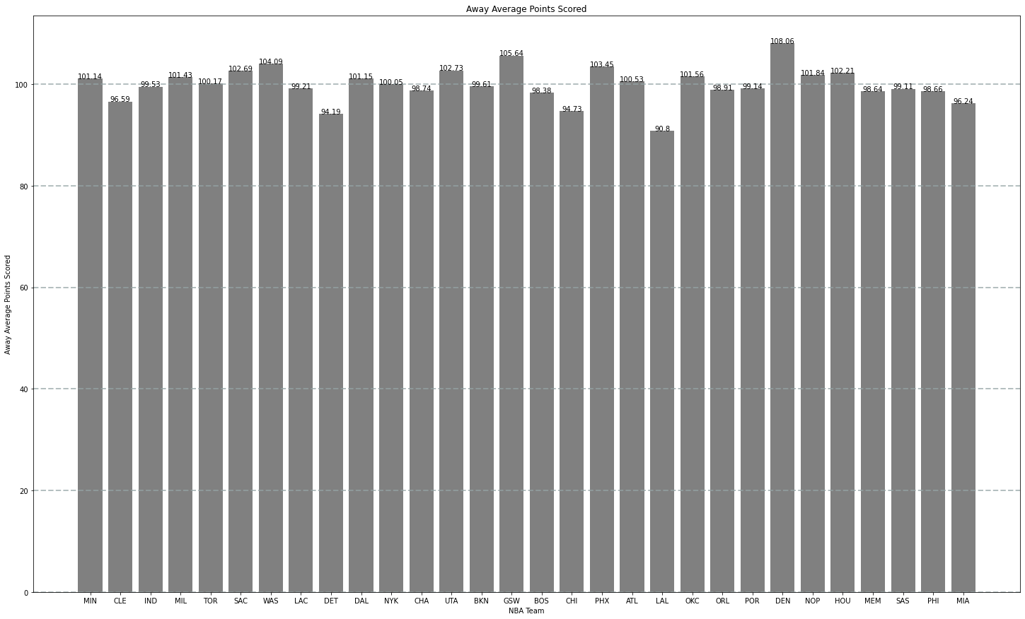 Calculating the average of all the teams, we a mean of 102.7 points scored per game with a standard deviation of 2.35 points. That means that from team to team, we can estimate the home scores will usually be within one bucket of each other? I was expecting a much larger variance from team to team, but this is so cool to see in charts. If this is the average of the teams at home, what does it look like when they play away?